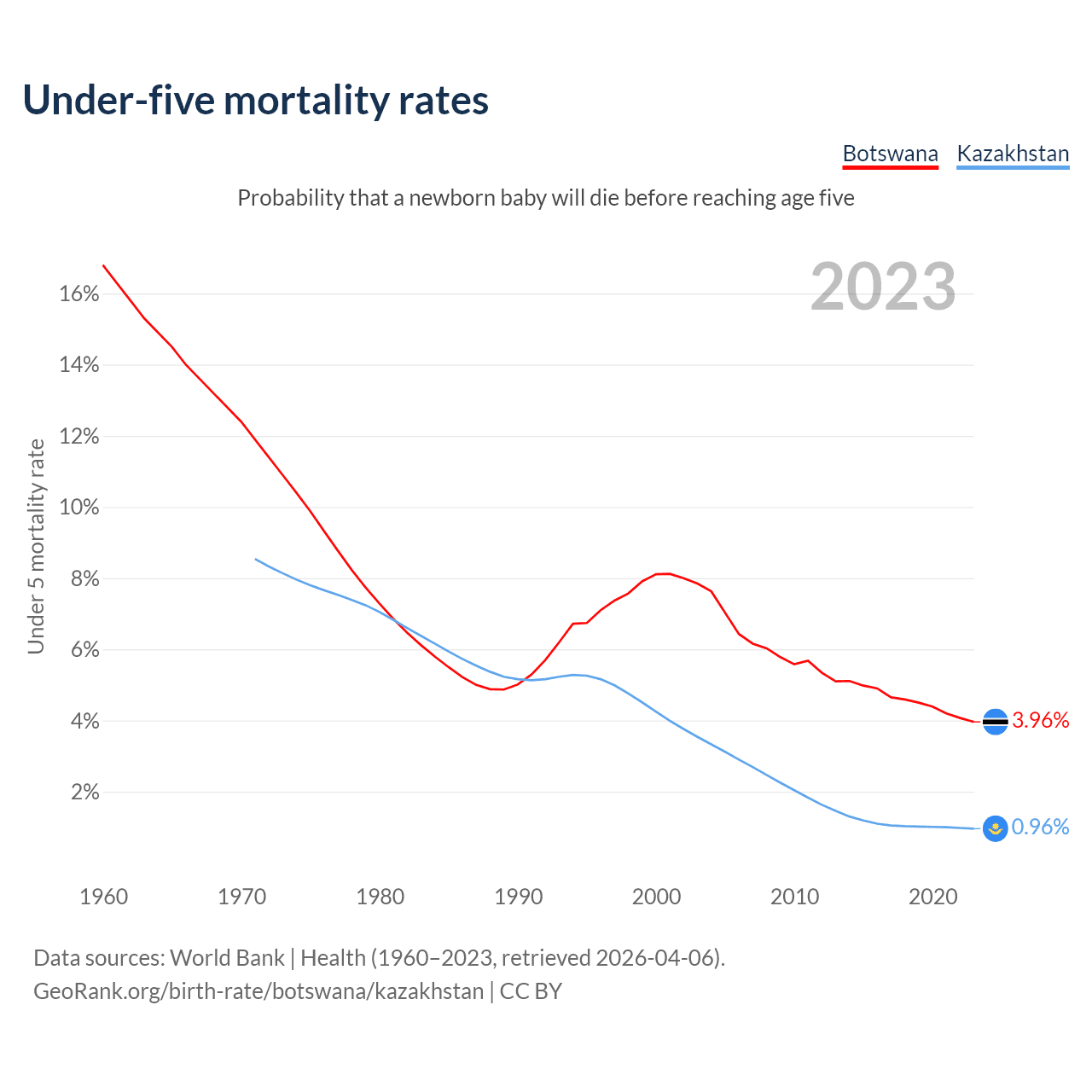 The chance that a newborn baby will die before reaching age five is 3.96% in Botswana and 0.96% in Kazakhstan. Above is a chart with historical data on under-five mortality rates.
