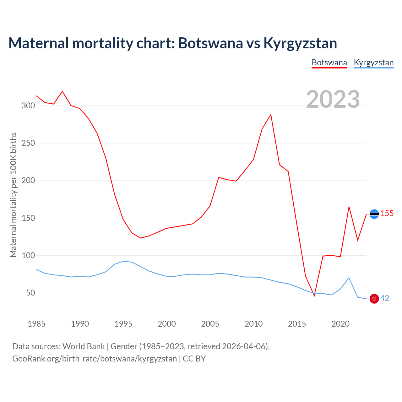 The maternal mortality rate, which is the probability of dying during childbirth or within 42 days of pregnancy termination, is 155 deaths per 100,000 live births in Botswana, compared to 42 deaths in Kyrgyzstan.