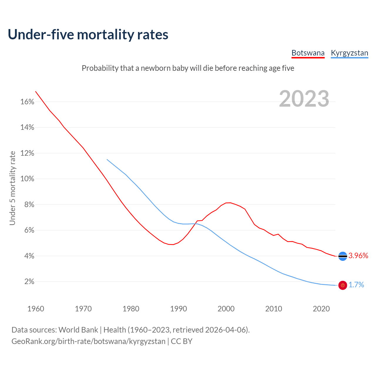 The chance that a newborn baby will die before reaching age five is 3.96% in Botswana and 1.7% in Kyrgyzstan. Above is a chart with historical data on under-five mortality rates.