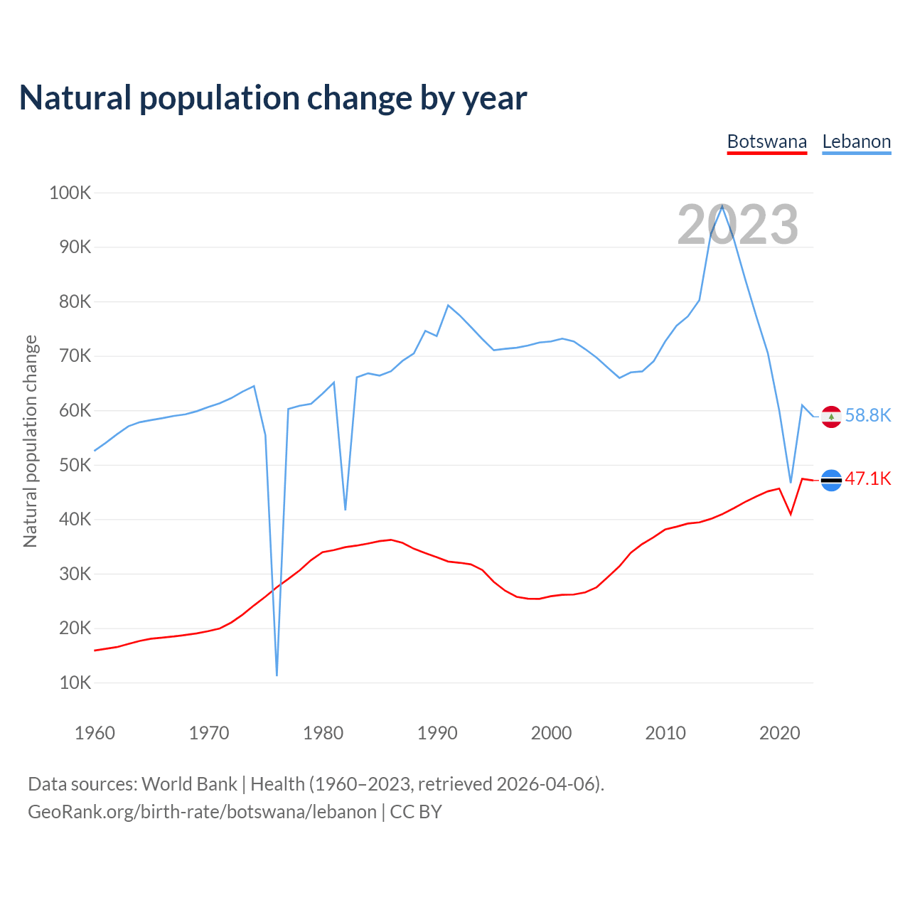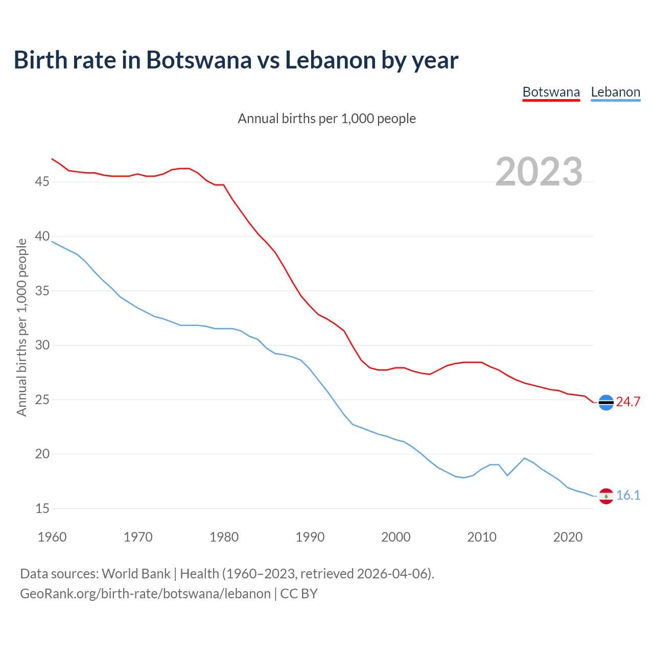 Botswana has an annual birth rate of 24.7 births per 1,000 people, compared to 16.1 for Lebanon. The average number of children a woman is expected to have during her lifetime — the fertility rate, is 2.73 in Botswana and 2.24 in Lebanon — 18% difference.