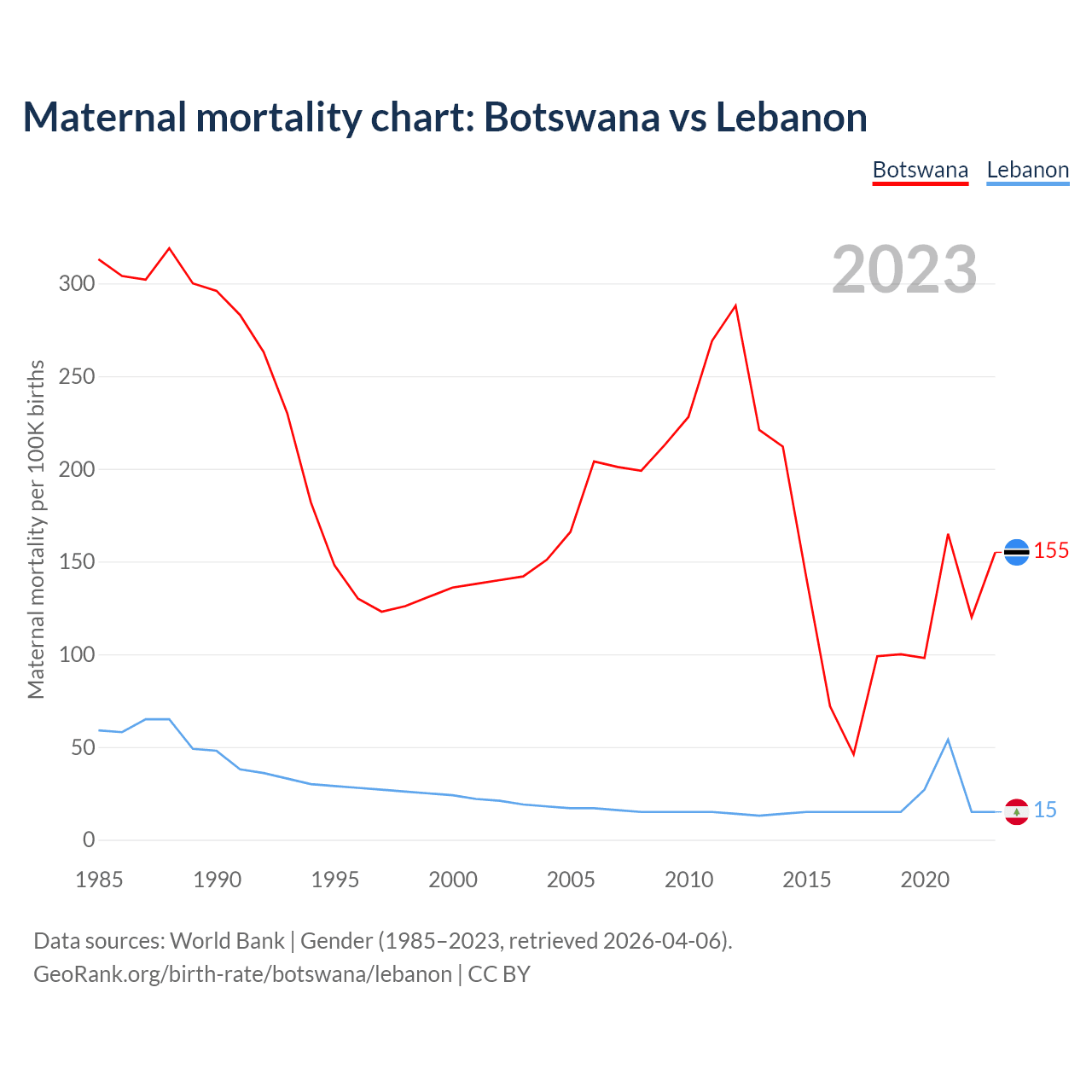 The maternal mortality rate, which is the probability of dying during childbirth or within 42 days of pregnancy termination, is 155 deaths per 100,000 live births in Botswana, compared to 15 deaths in Lebanon.