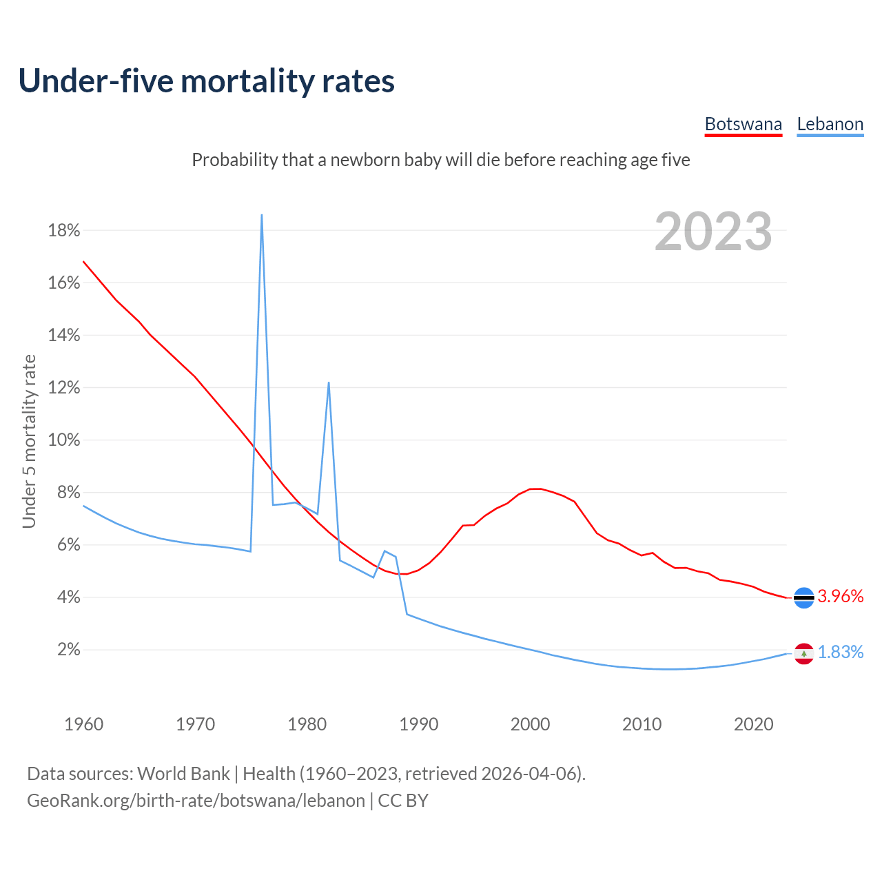 The chance that a newborn baby will die before reaching age five is 3.96% in Botswana and 1.83% in Lebanon. Above is a chart with historical data on under-five mortality rates.