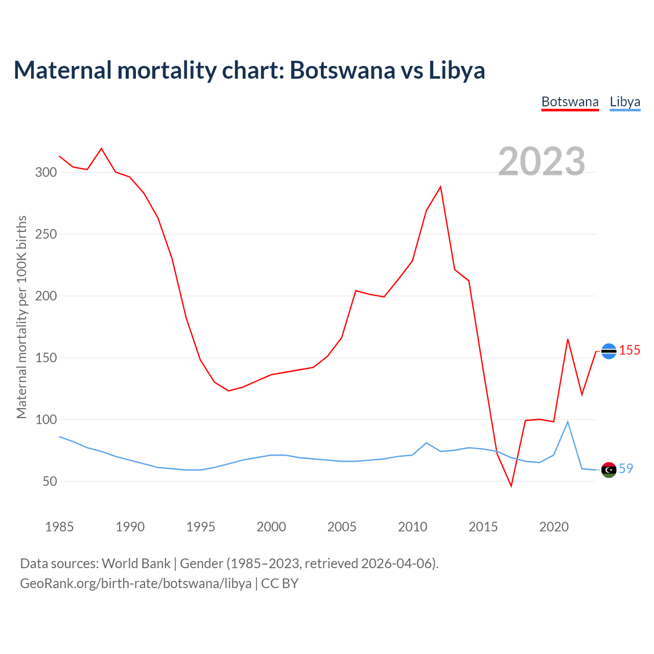 The maternal mortality rate, which is the probability of dying during childbirth or within 42 days of pregnancy termination, is 155 deaths per 100,000 live births in Botswana, compared to 59 deaths in Libya.