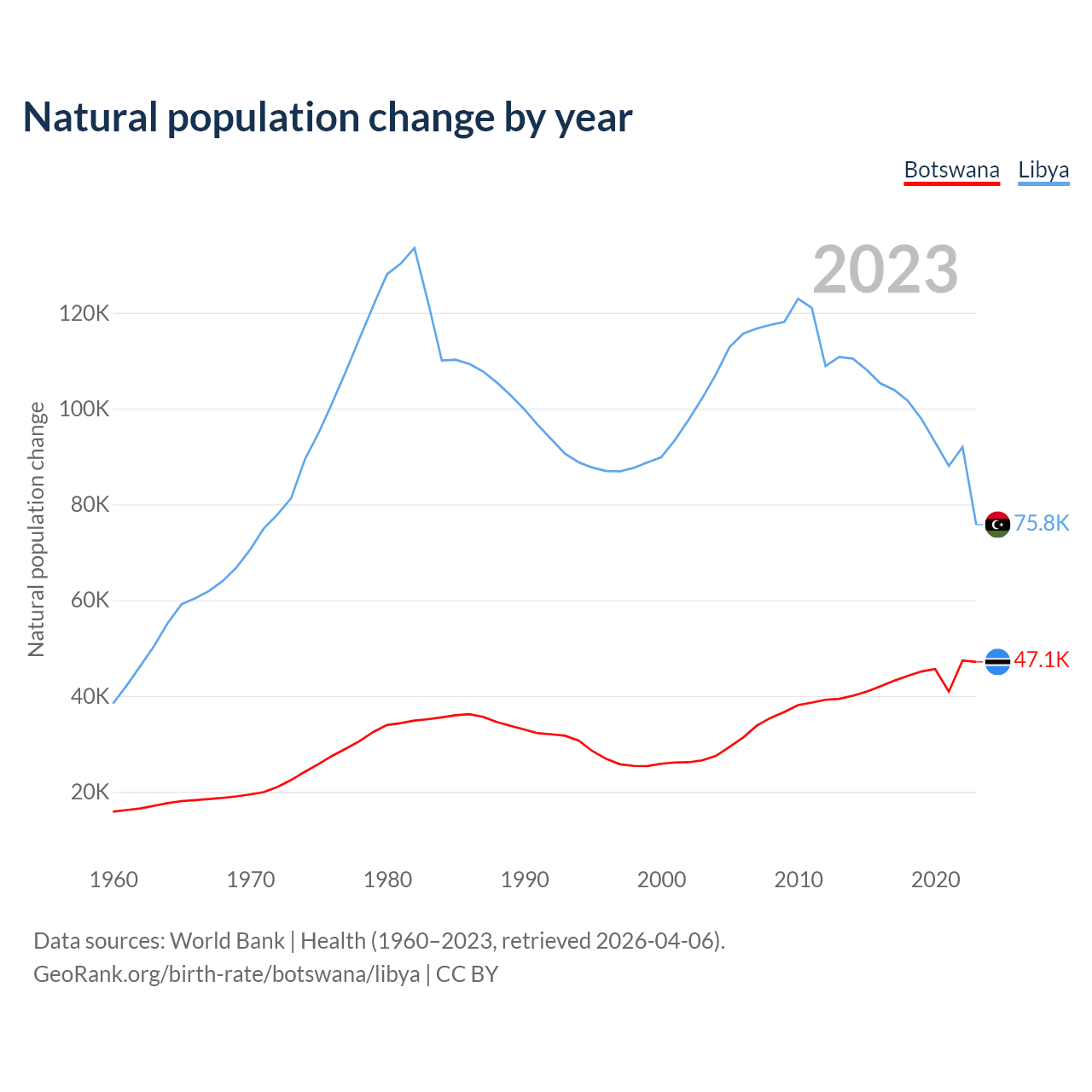 According to the latest available data on birth rates, the fertility rate in Botswana was 2.73 children per woman in 2023, compared to 2.36 in Libya in 2023. The replacement level is considered to be 2.1 children per woman.