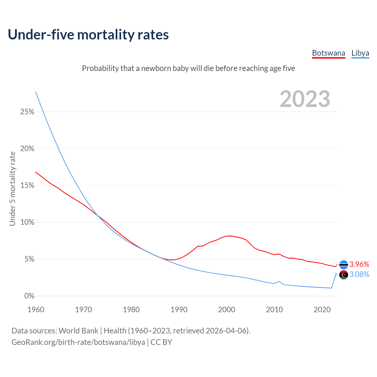 The chance that a newborn baby will die before reaching age five is 3.96% in Botswana and 3.08% in Libya. Above is a chart with historical data on under-five mortality rates.