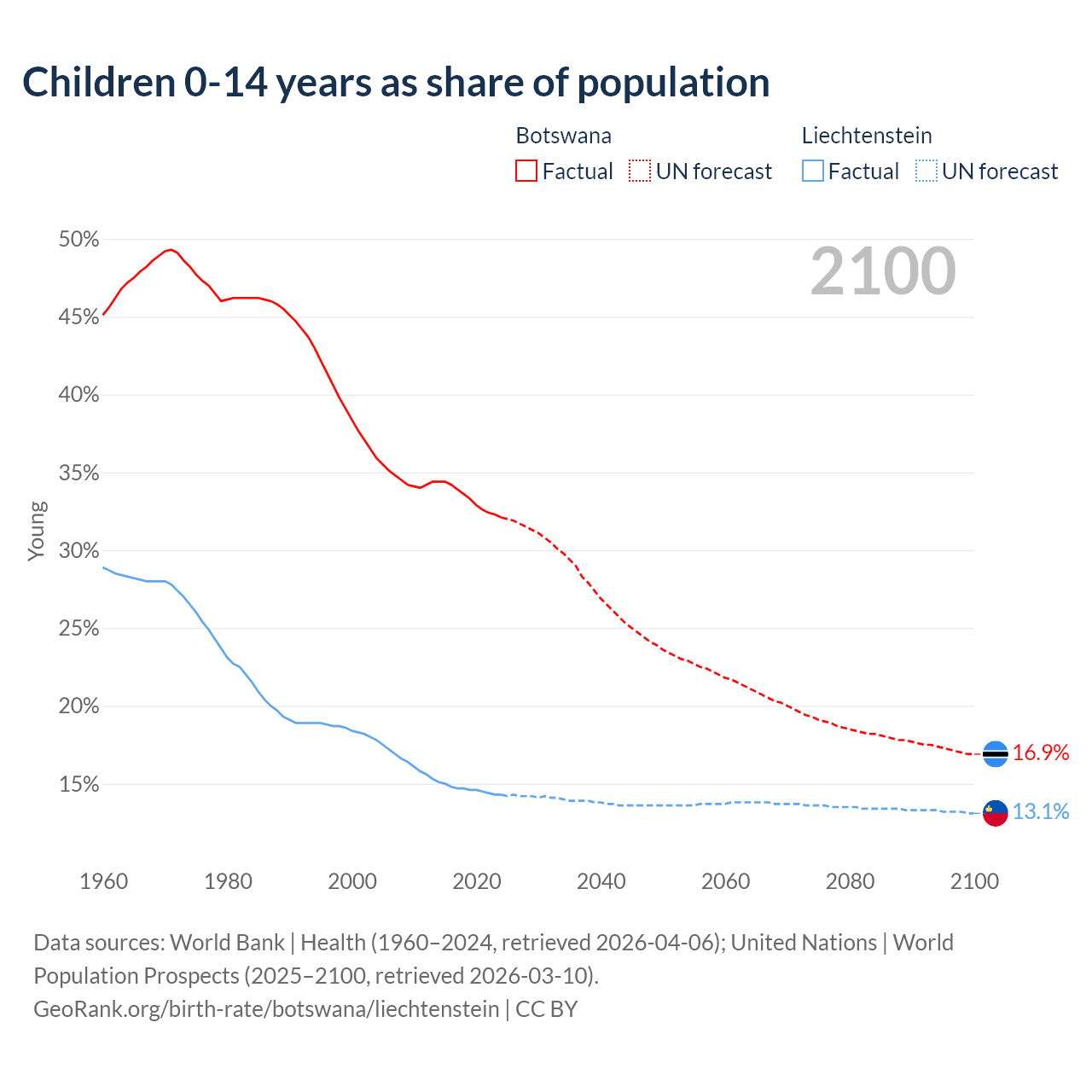 Children aged 0-14 make up 32.1% of the population in Botswana and 14.3% in Liechtenstein in 2024, compared to 45.1% and 19.1% respectively in 1990.