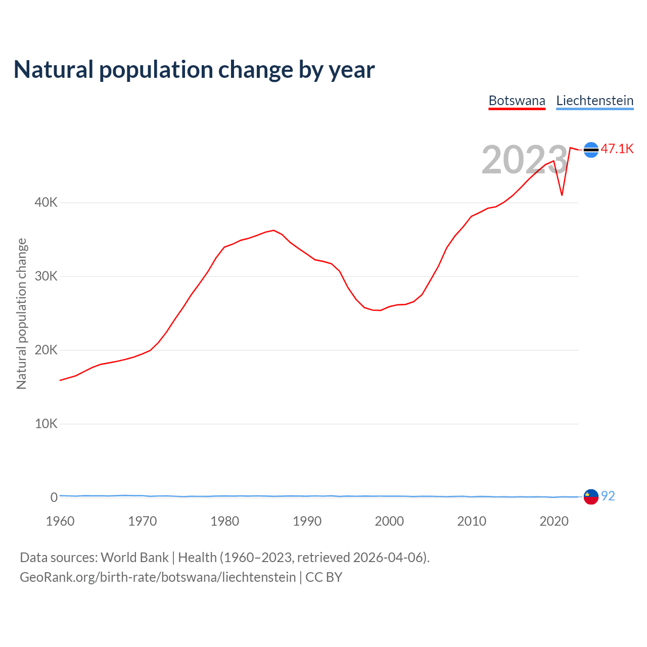 Botswana has an annual birth rate of 24.7 births per 1,000 people, compared to 9.1 for Liechtenstein. The average number of children a woman is expected to have during her lifetime — the fertility rate, is 2.73 in Botswana and 1.45 in Liechtenstein — 46.9% difference.