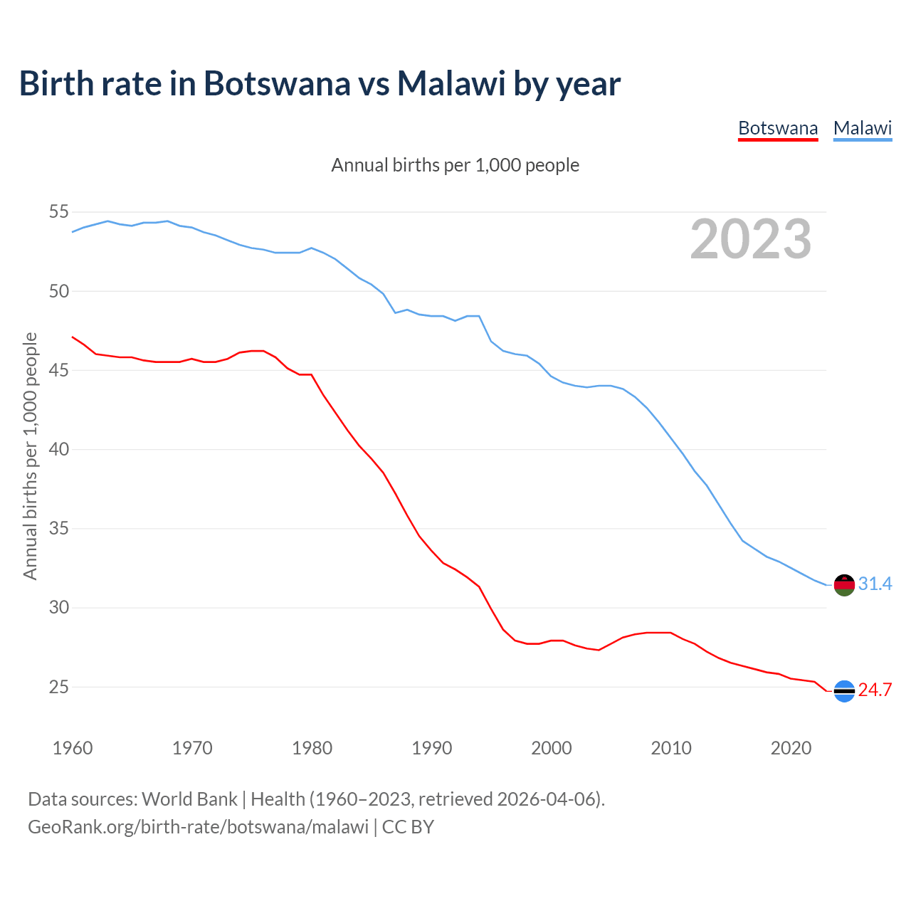 Botswana has an annual birth rate of 24.7 births per 1,000 people, compared to 31.4 for Malawi. The average number of children a woman is expected to have during her lifetime — the fertility rate, is 2.73 in Botswana and 3.65 in Malawi — 33.5% difference.