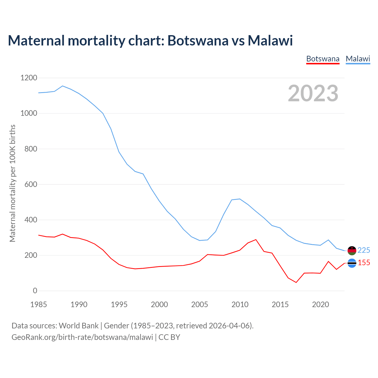 The maternal mortality rate, which is the probability of dying during childbirth or within 42 days of pregnancy termination, is 155 deaths per 100,000 live births in Botswana, compared to 225 deaths in Malawi.