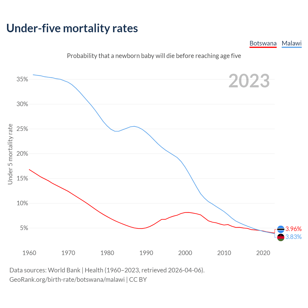 The chance that a newborn baby will die before reaching age five is 3.96% in Botswana and 3.83% in Malawi. Above is a chart with historical data on under-five mortality rates.