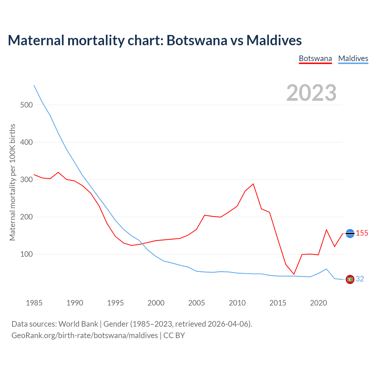 The maternal mortality rate, which is the probability of dying during childbirth or within 42 days of pregnancy termination, is 155 deaths per 100,000 live births in Botswana, compared to 32 deaths in Maldives.