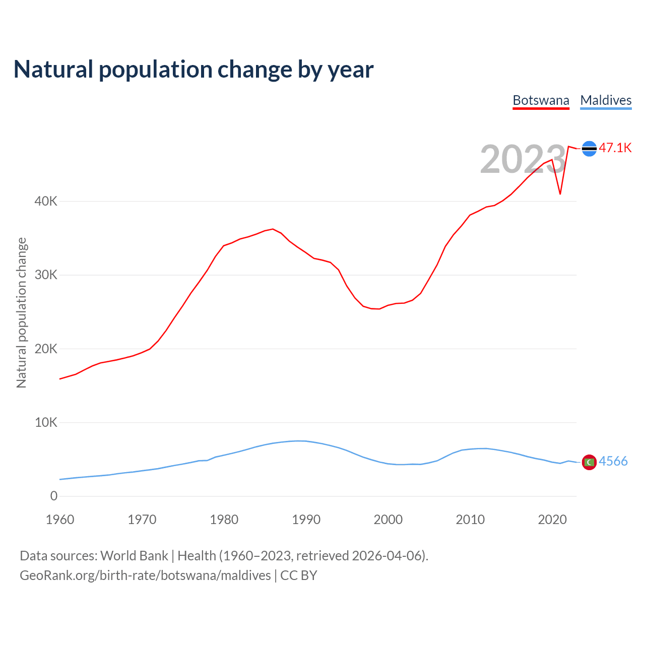 Botswana has an annual birth rate of 24.7 births per 1,000 people, compared to 11 for Maldives. The average number of children a woman is expected to have during her lifetime — the fertility rate, is 2.73 in Botswana and 1.58 in Maldives — 42.3% difference.