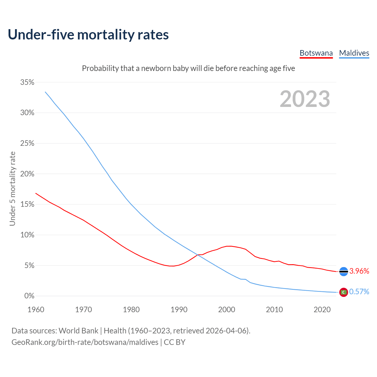 The chance that a newborn baby will die before reaching age five is 3.96% in Botswana and 0.57% in Maldives. Above is a chart with historical data on under-five mortality rates.