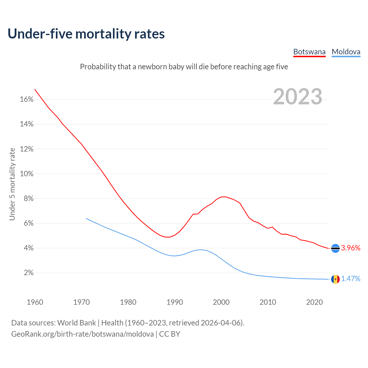 The chance that a newborn baby will die before reaching age five is 3.96% in Botswana and 1.47% in Moldova. Above is a chart with historical data on under-five mortality rates.