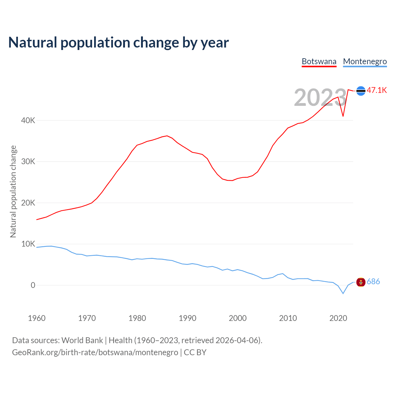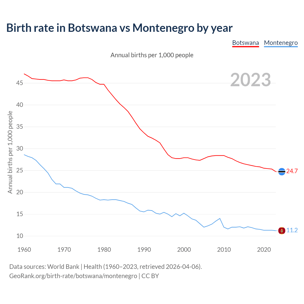 Botswana has an annual birth rate of 24.7 births per 1,000 people, compared to 11.2 for Montenegro. The average number of children a woman is expected to have during her lifetime — the fertility rate, is 2.73 in Botswana and 1.74 in Montenegro — 36.3% difference.