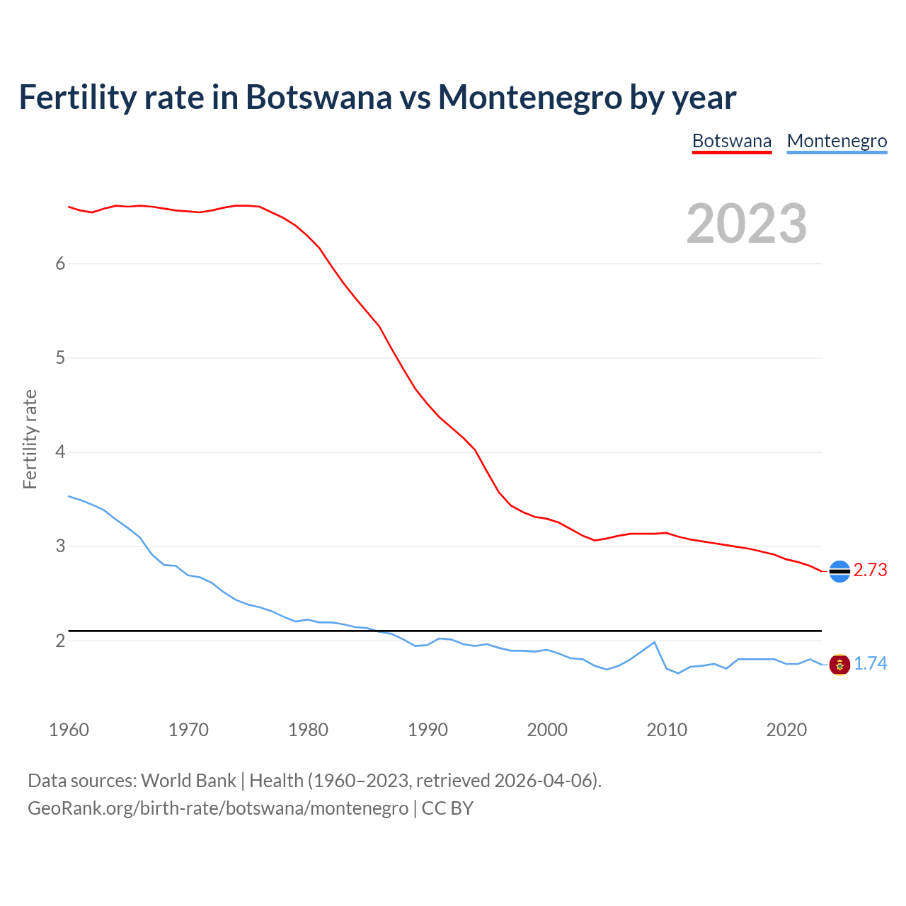 According to the latest available data on birth rates, the fertility rate in Botswana was 2.73 children per woman in 2023, compared to 1.74 in Montenegro in 2023. The replacement level is considered to be 2.1 children per woman.