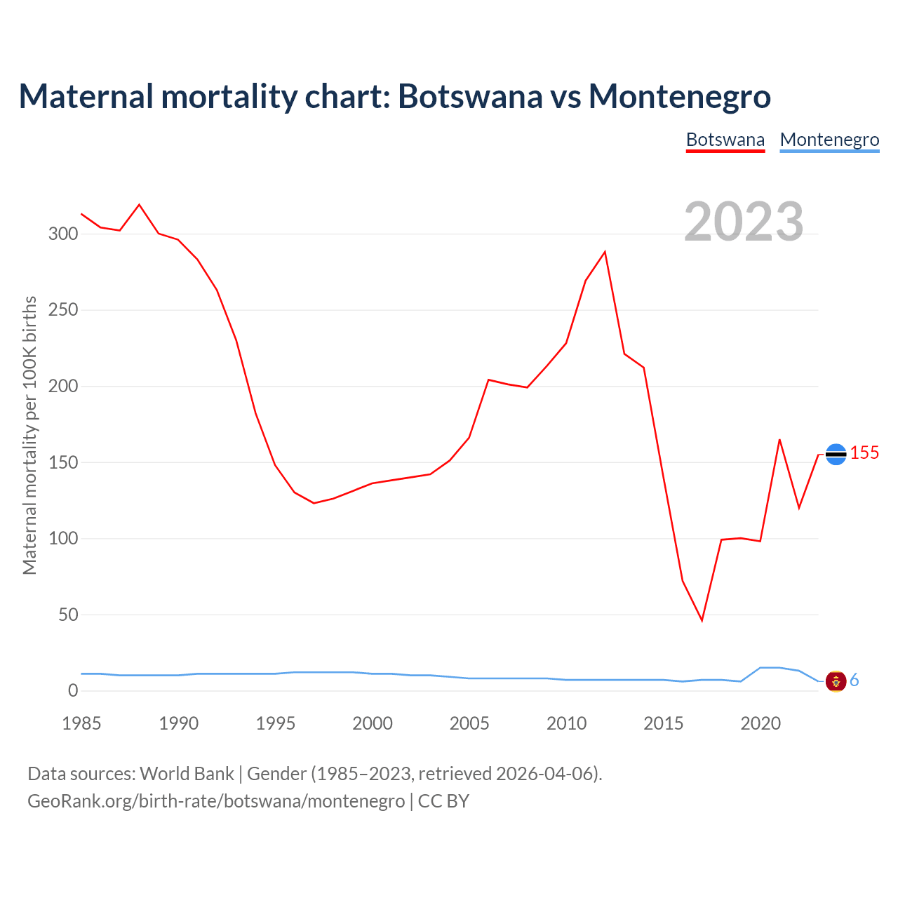 The maternal mortality rate, which is the probability of dying during childbirth or within 42 days of pregnancy termination, is 155 deaths per 100,000 live births in Botswana, compared to 6 deaths in Montenegro.