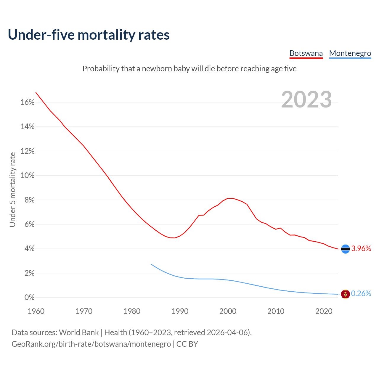 The chance that a newborn baby will die before reaching age five is 3.96% in Botswana and 0.26% in Montenegro. Above is a chart with historical data on under-five mortality rates.