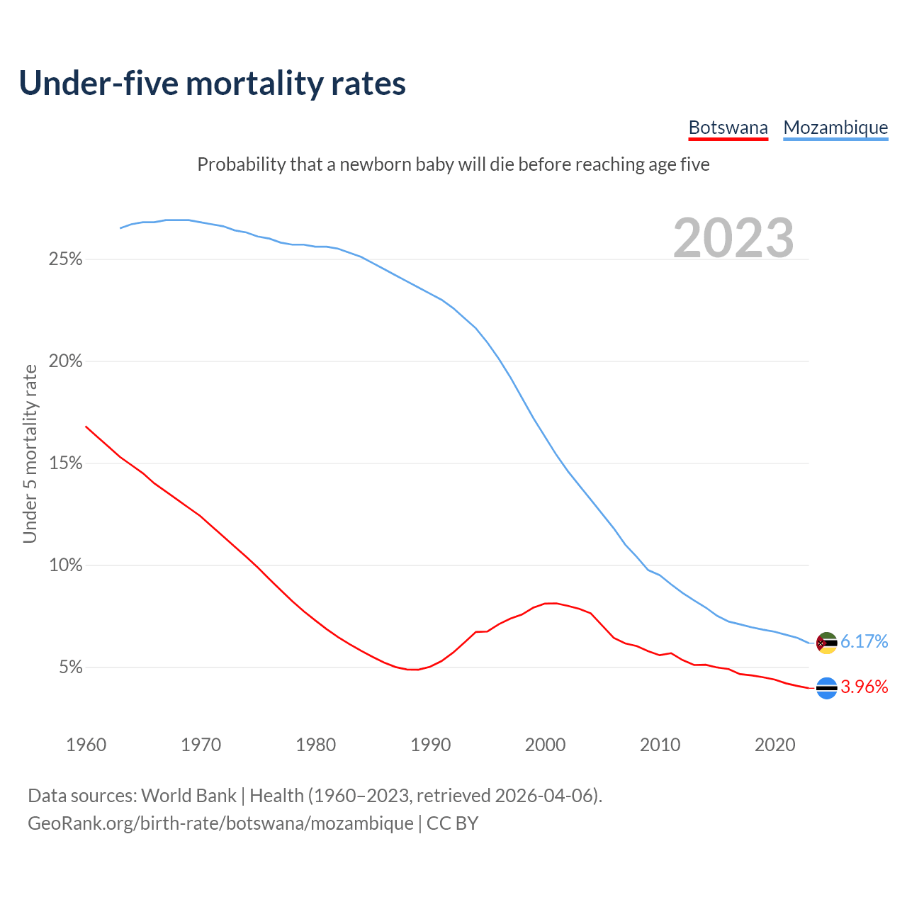 The chance that a newborn baby will die before reaching age five is 3.96% in Botswana and 6.17% in Mozambique. Above is a chart with historical data on under-five mortality rates.