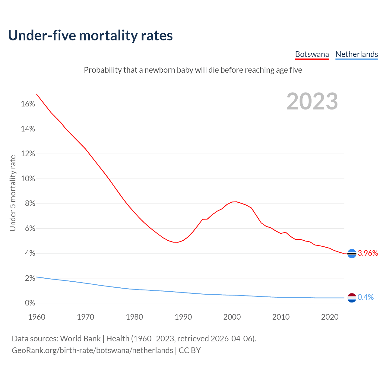 The chance that a newborn baby will die before reaching age five is 3.96% in Botswana and 0.4% in the Netherlands. Above is a chart with historical data on under-five mortality rates.
