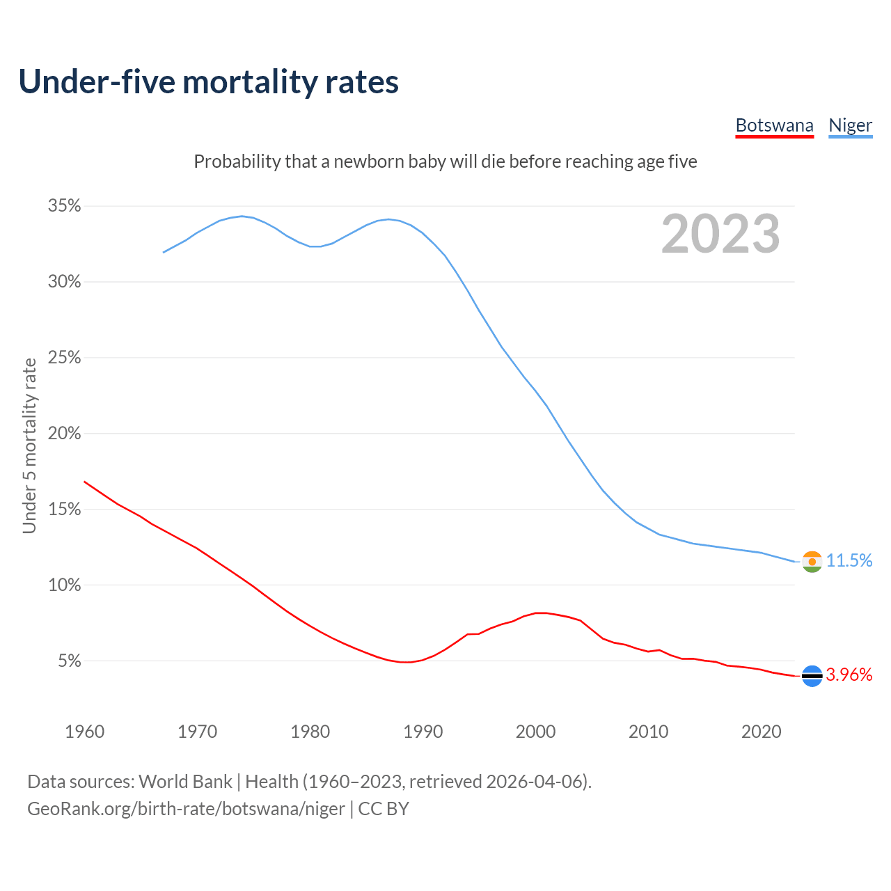 The chance that a newborn baby will die before reaching age five is 3.96% in Botswana and 11.5% in Niger. Above is a chart with historical data on under-five mortality rates.
