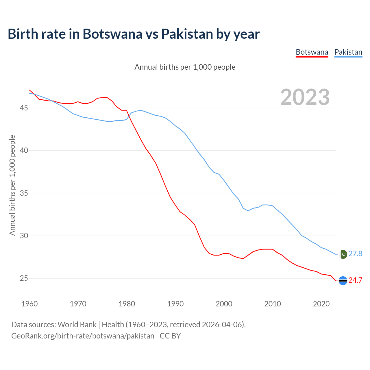 Botswana has an annual birth rate of 24.7 births per 1,000 people, compared to 27.8 for Pakistan. The average number of children a woman is expected to have during her lifetime — the fertility rate, is 2.73 in Botswana and 3.61 in Pakistan — 32% difference.