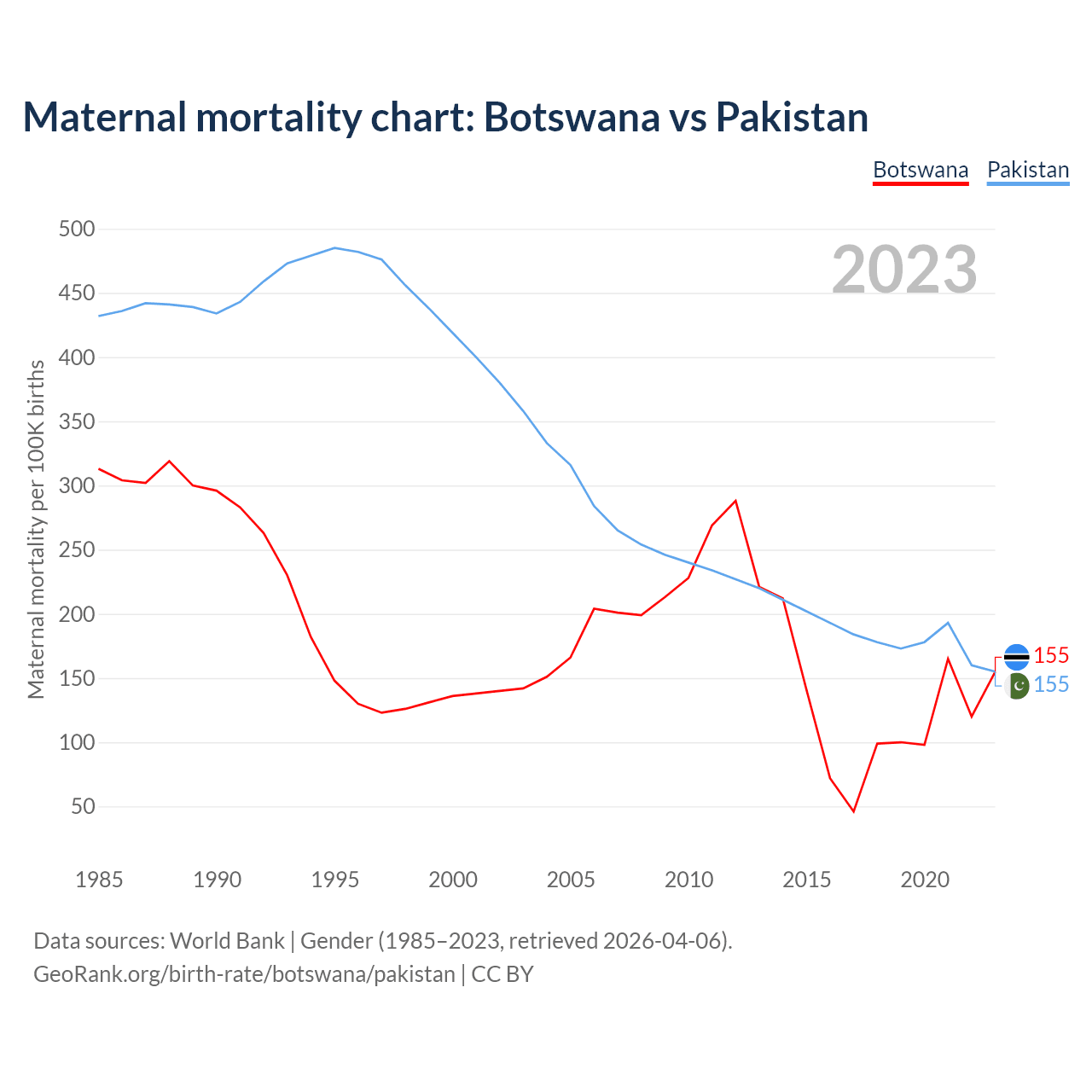 The maternal mortality rate, which is the probability of dying during childbirth or within 42 days of pregnancy termination, is 155 deaths per 100,000 live births in Botswana, compared to 155 deaths in Pakistan.