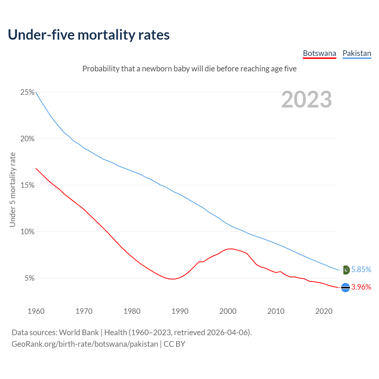 The chance that a newborn baby will die before reaching age five is 3.96% in Botswana and 5.85% in Pakistan. Above is a chart with historical data on under-five mortality rates.