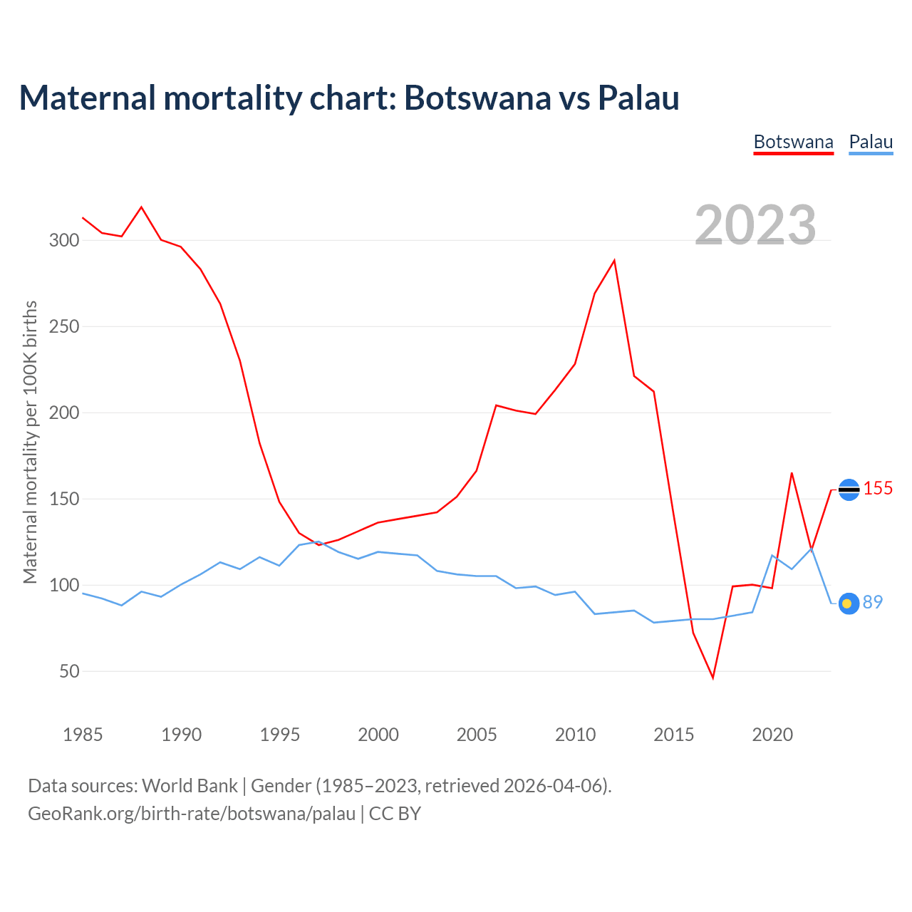The maternal mortality rate, which is the probability of dying during childbirth or within 42 days of pregnancy termination, is 155 deaths per 100,000 live births in Botswana, compared to 89 deaths in Palau.