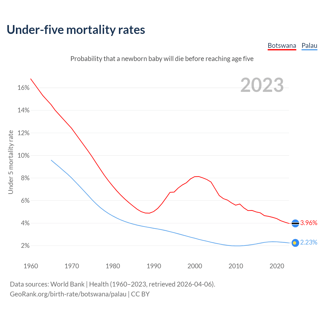 The chance that a newborn baby will die before reaching age five is 3.96% in Botswana and 2.23% in Palau. Above is a chart with historical data on under-five mortality rates.