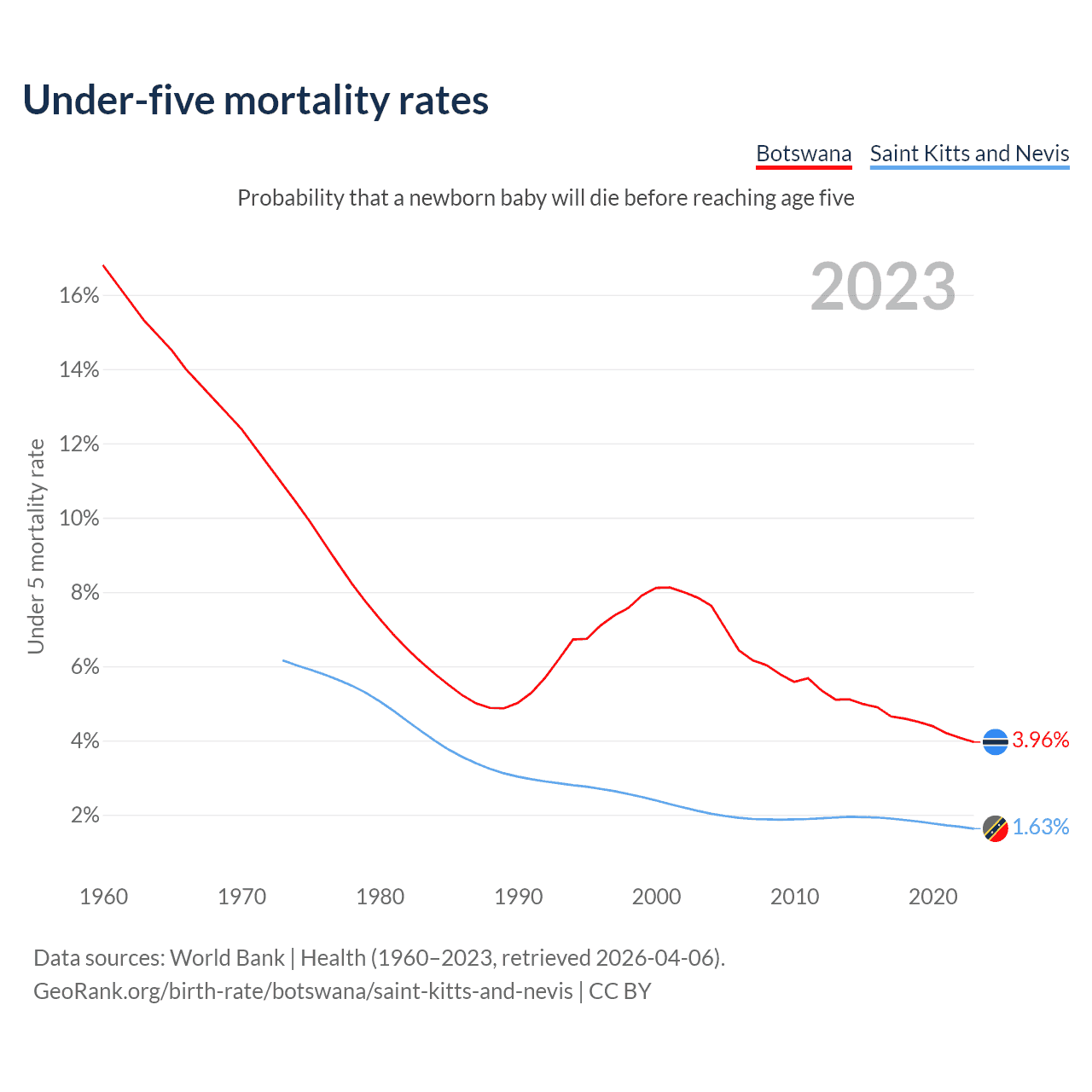 The chance that a newborn baby will die before reaching age five is 3.96% in Botswana and 1.63% in Saint Kitts and Nevis. Above is a chart with historical data on under-five mortality rates.