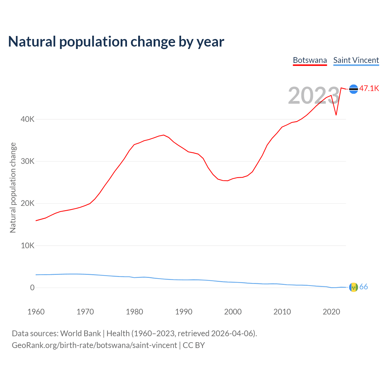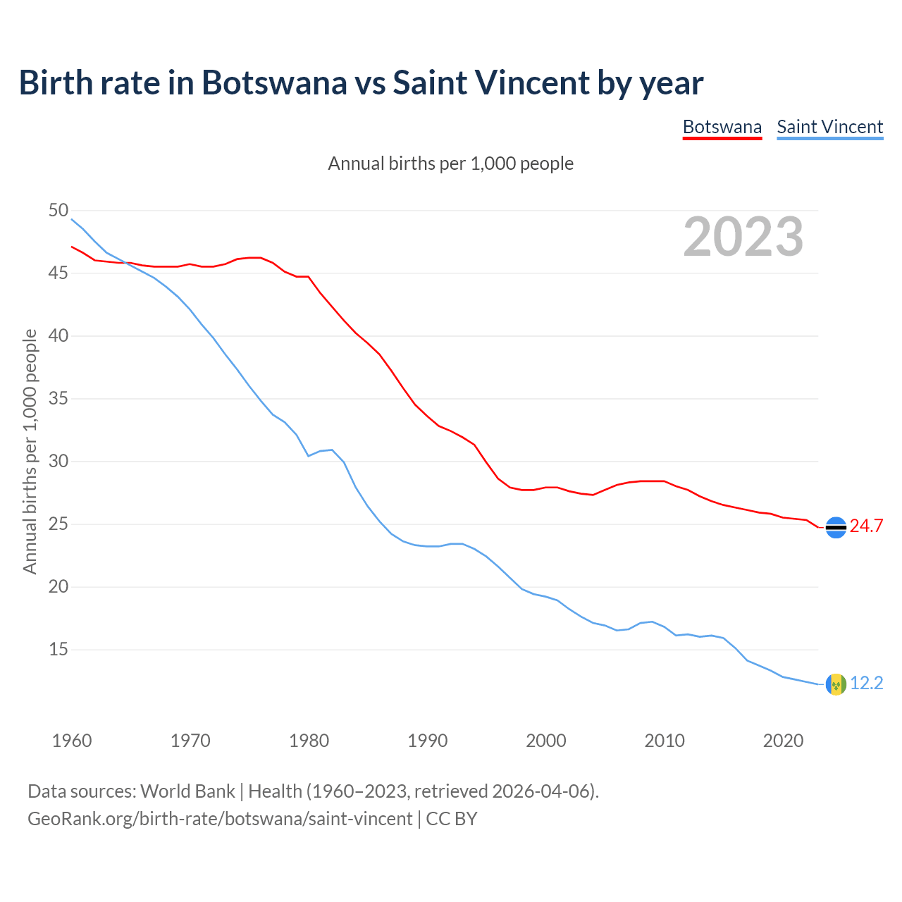 Botswana has an annual birth rate of 24.7 births per 1,000 people, compared to 12.2 for Saint Vincent. The average number of children a woman is expected to have during her lifetime — the fertility rate, is 2.73 in Botswana and 1.78 in Saint Vincent — 35% difference.
