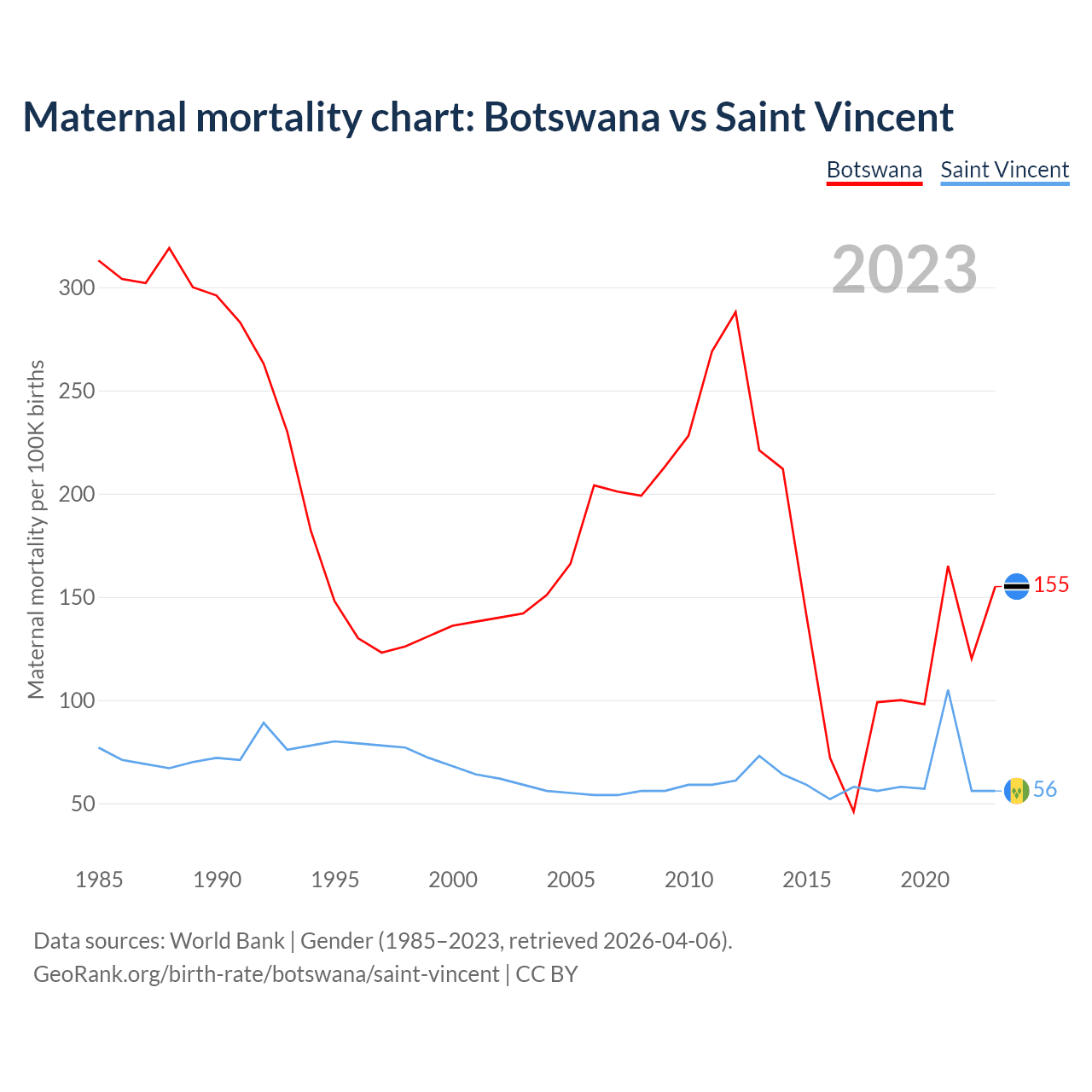 The maternal mortality rate, which is the probability of dying during childbirth or within 42 days of pregnancy termination, is 155 deaths per 100,000 live births in Botswana, compared to 56 deaths in Saint Vincent.