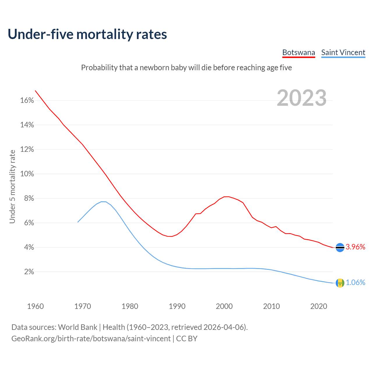 The chance that a newborn baby will die before reaching age five is 3.96% in Botswana and 1.06% in Saint Vincent. Above is a chart with historical data on under-five mortality rates.