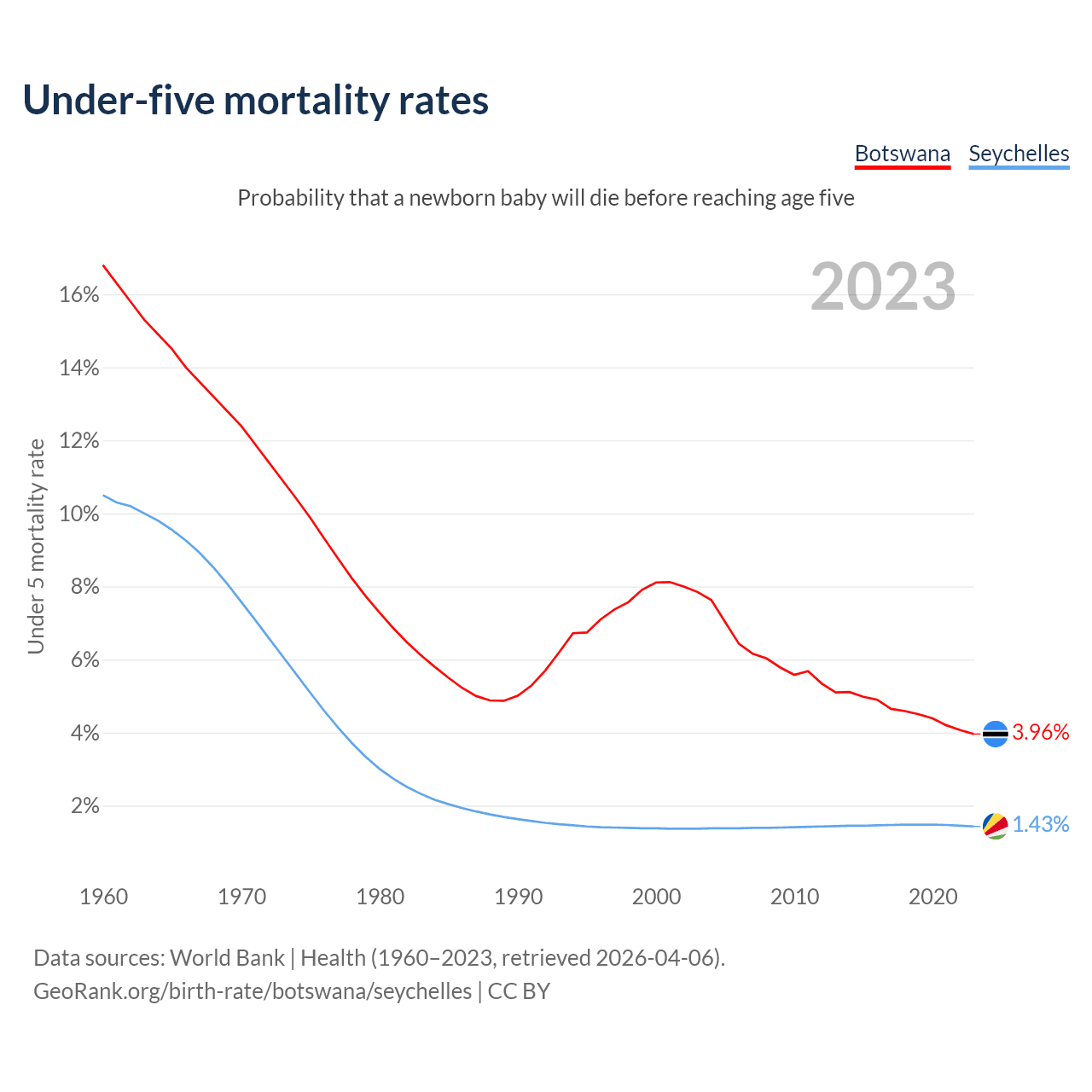 The chance that a newborn baby will die before reaching age five is 3.96% in Botswana and 1.43% in the Seychelles. Above is a chart with historical data on under-five mortality rates.