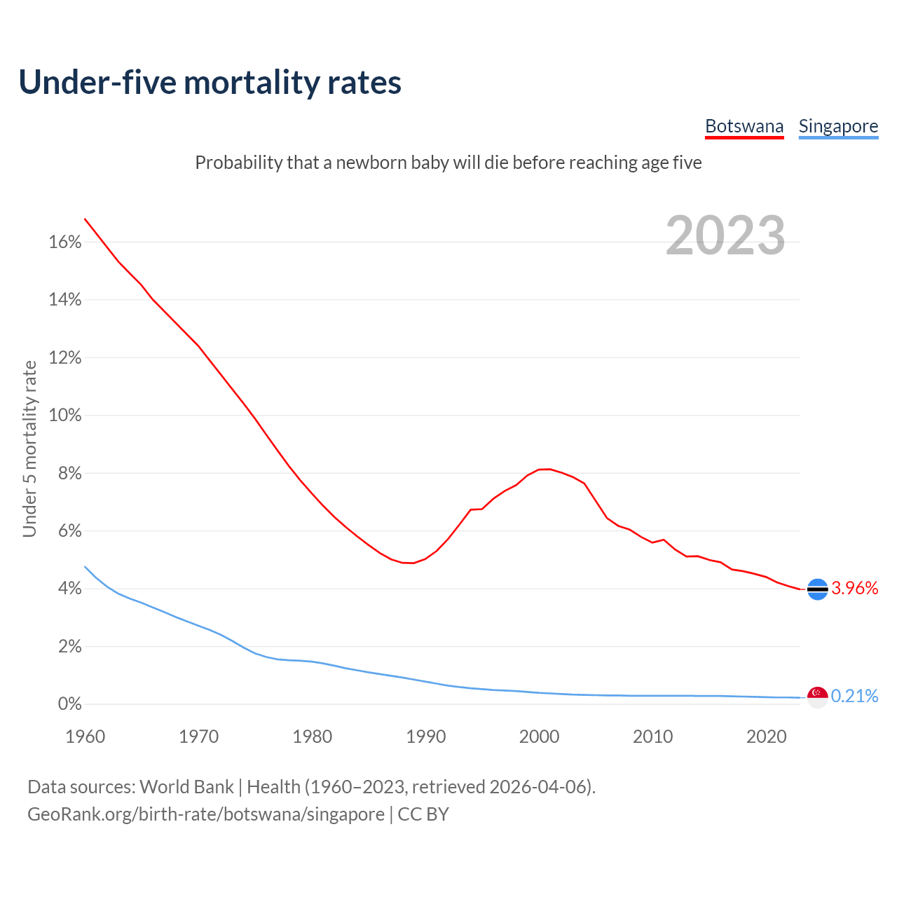 The chance that a newborn baby will die before reaching age five is 3.96% in Botswana and 0.21% in Singapore. Above is a chart with historical data on under-five mortality rates.