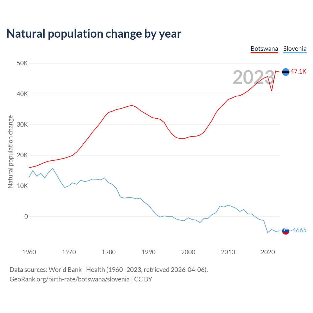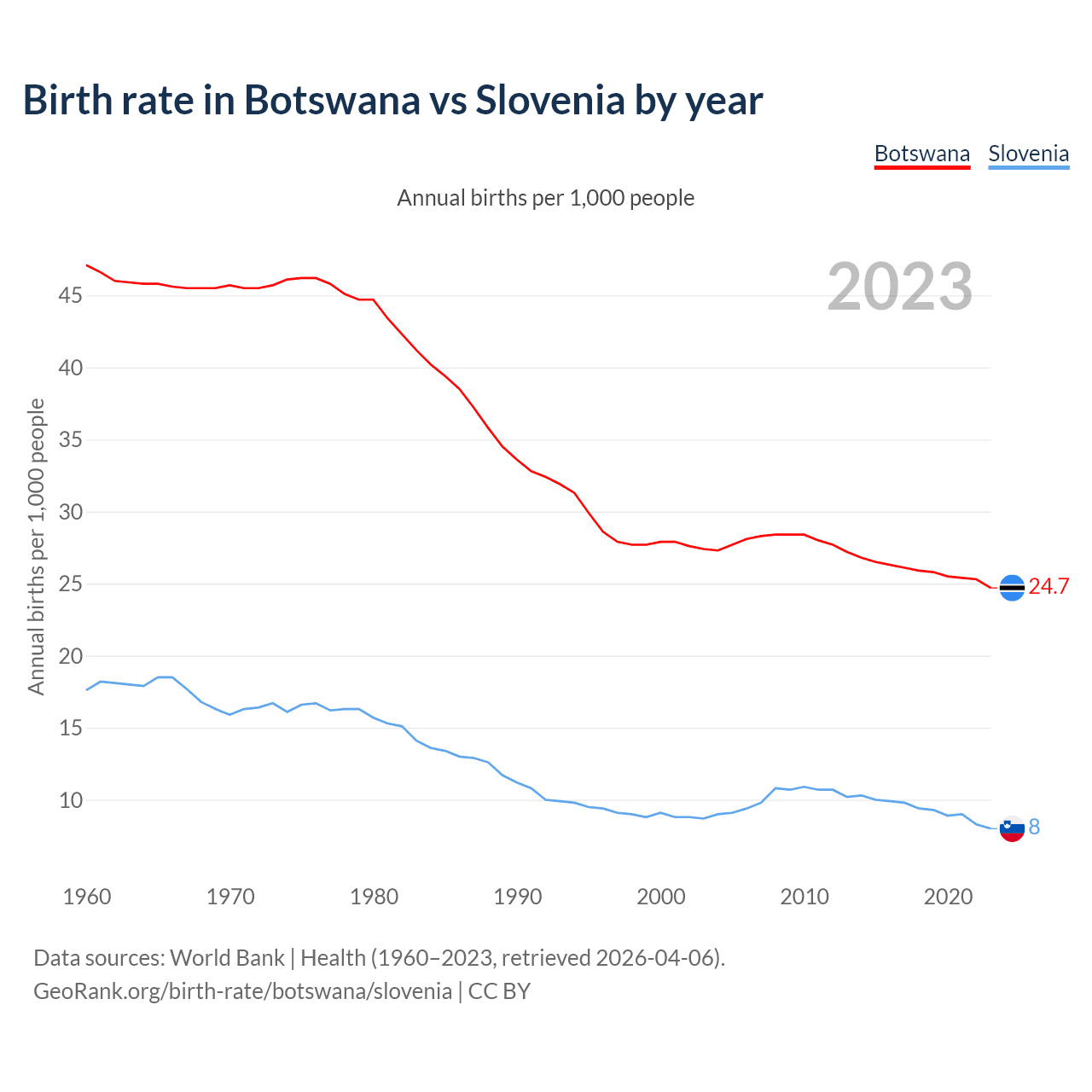 Botswana has an annual birth rate of 24.7 births per 1,000 people, compared to 8 for Slovenia. The average number of children a woman is expected to have during her lifetime — the fertility rate, is 2.73 in Botswana and 1.51 in Slovenia — 44.7% difference.