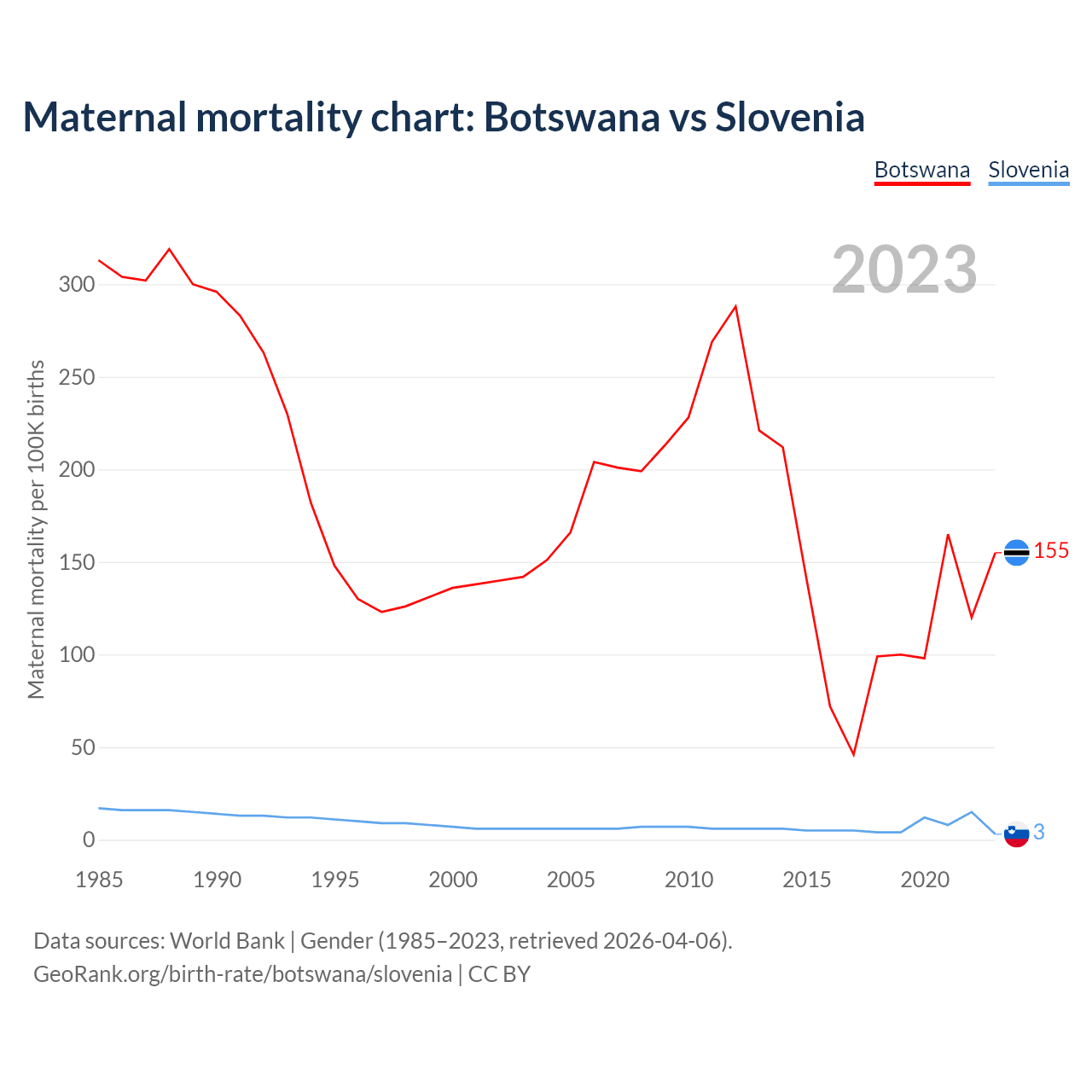The maternal mortality rate, which is the probability of dying during childbirth or within 42 days of pregnancy termination, is 155 deaths per 100,000 live births in Botswana, compared to 3 deaths in Slovenia.