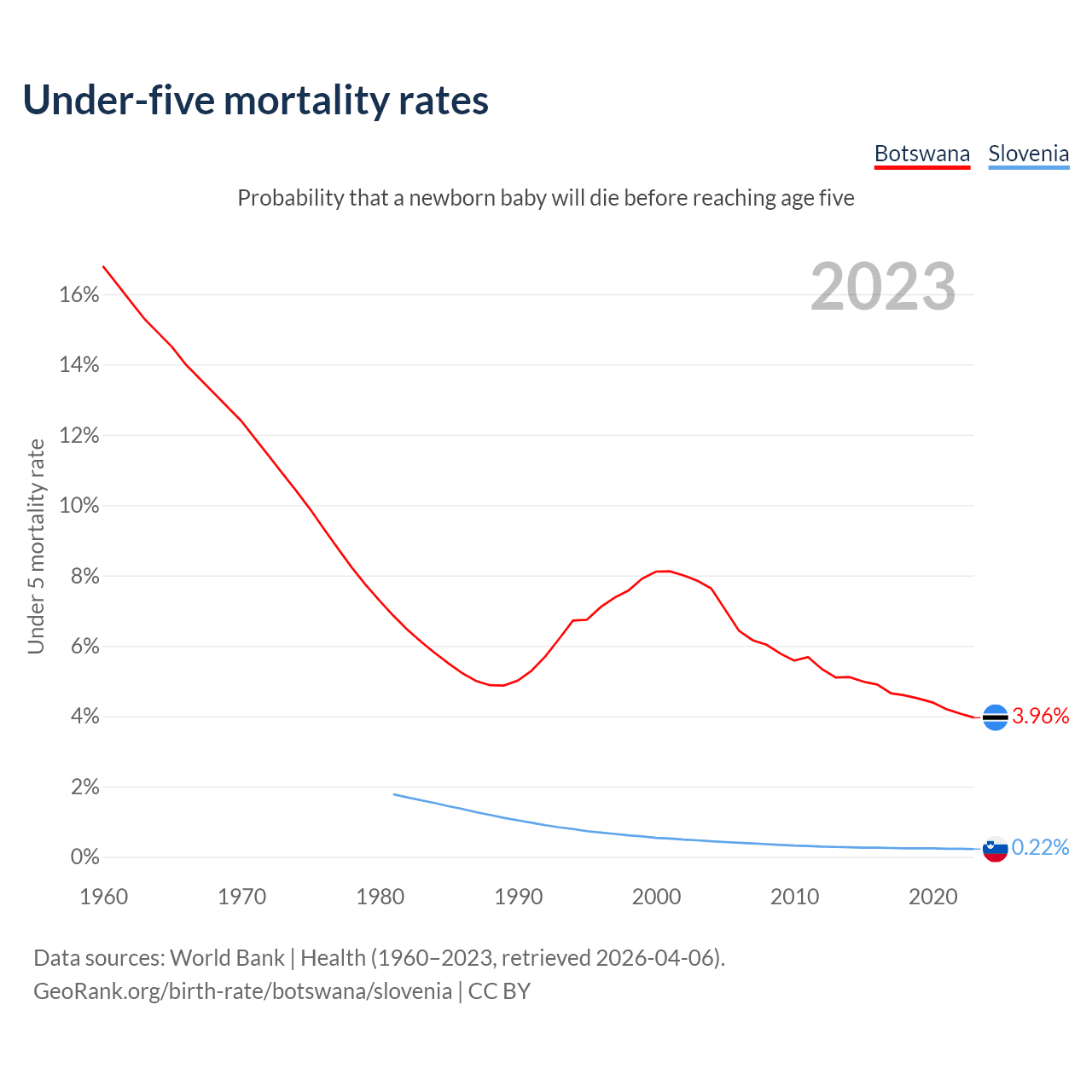 The chance that a newborn baby will die before reaching age five is 3.96% in Botswana and 0.22% in Slovenia. Above is a chart with historical data on under-five mortality rates.