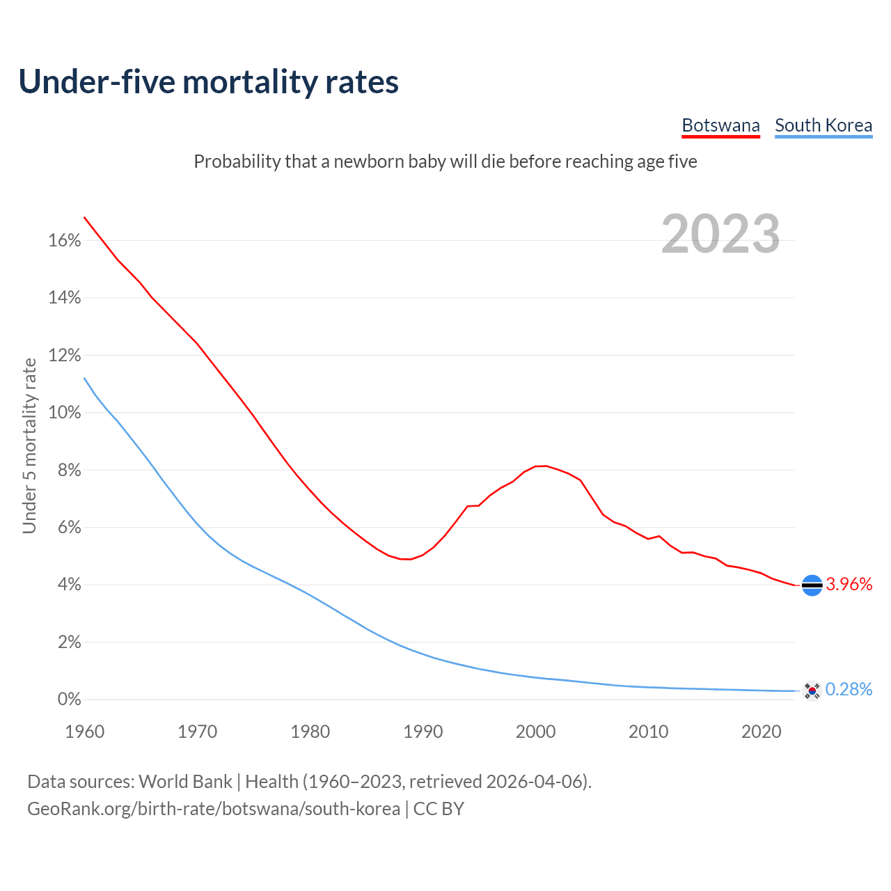 The chance that a newborn baby will die before reaching age five is 3.96% in Botswana and 0.28% in South Korea. Above is a chart with historical data on under-five mortality rates.