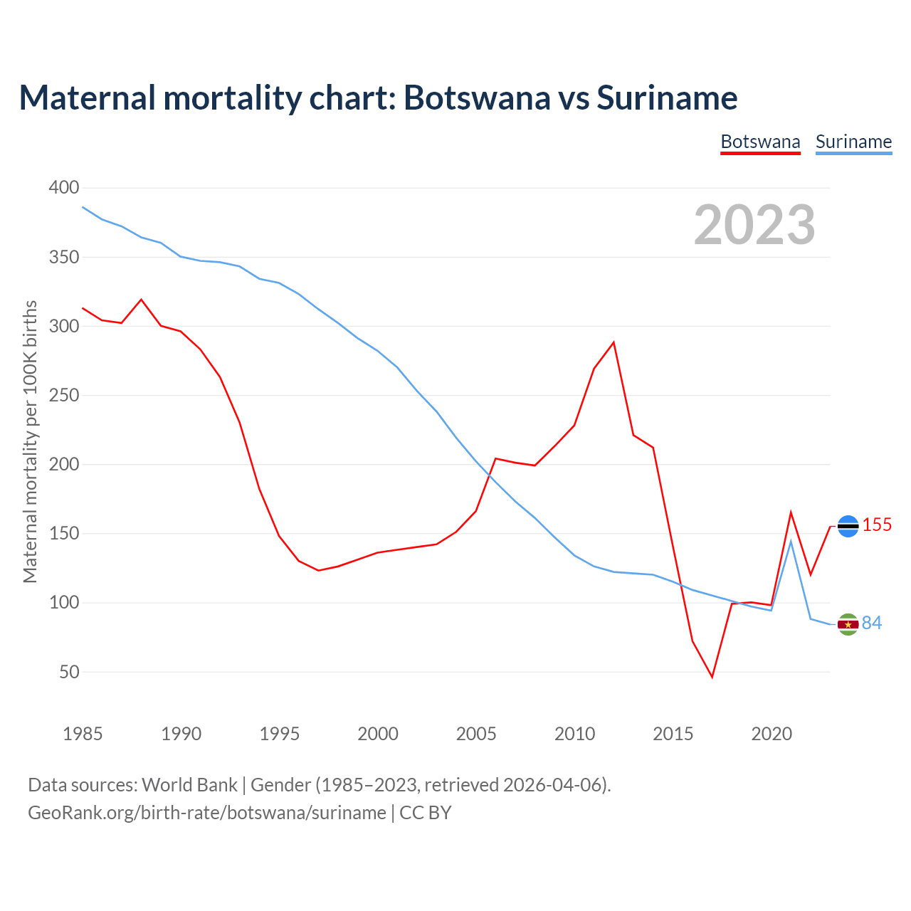 The maternal mortality rate, which is the probability of dying during childbirth or within 42 days of pregnancy termination, is 155 deaths per 100,000 live births in Botswana, compared to 84 deaths in Suriname.