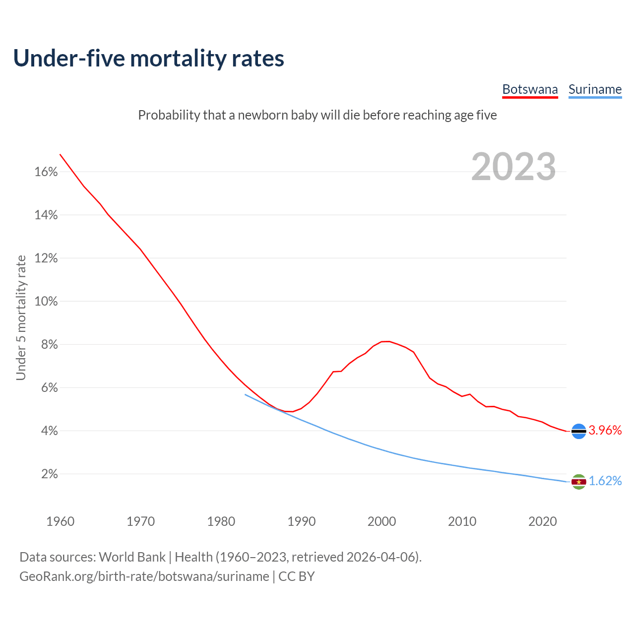 The chance that a newborn baby will die before reaching age five is 3.96% in Botswana and 1.62% in Suriname. Above is a chart with historical data on under-five mortality rates.