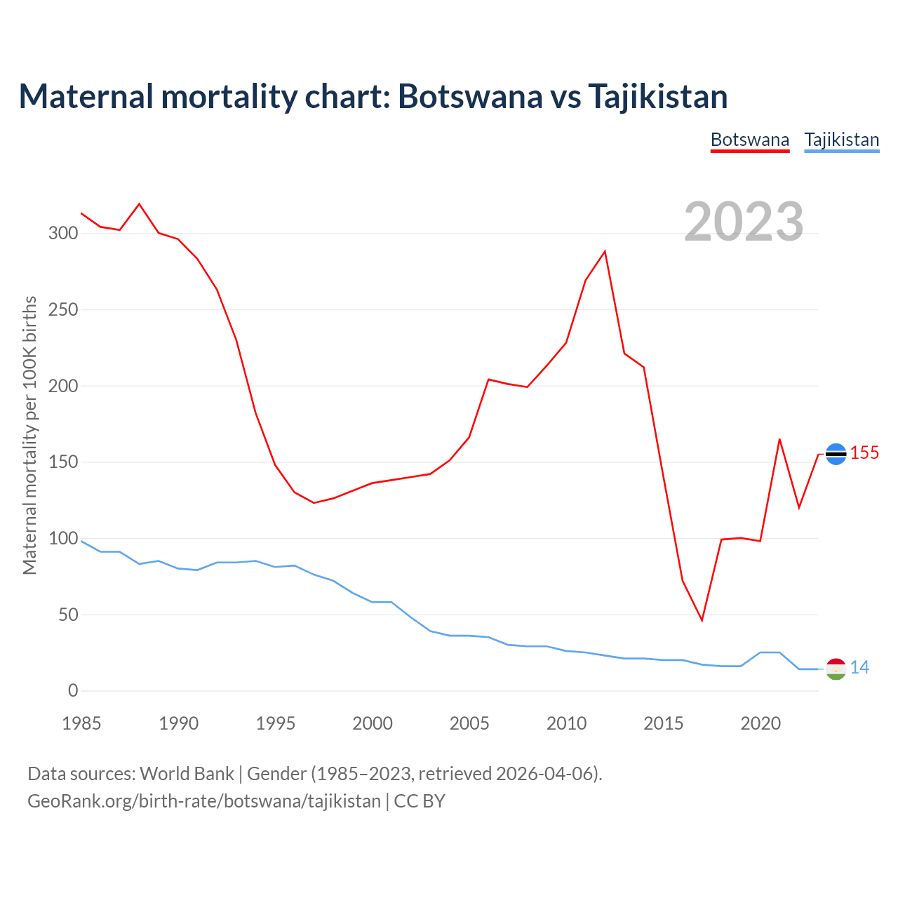 The maternal mortality rate, which is the probability of dying during childbirth or within 42 days of pregnancy termination, is 155 deaths per 100,000 live births in Botswana, compared to 14 deaths in Tajikistan.