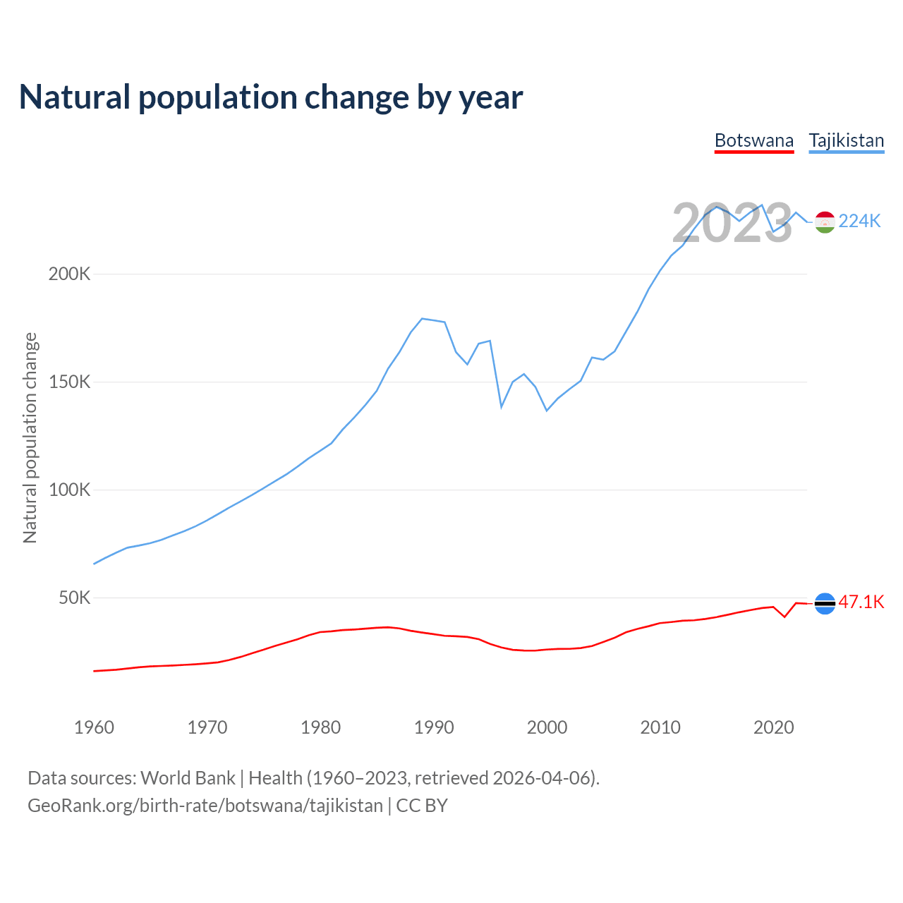 According to the latest available data on birth rates, the fertility rate in Botswana was 2.73 children per woman in 2023, compared to 3.07 in Tajikistan in 2023. The replacement level is considered to be 2.1 children per woman.