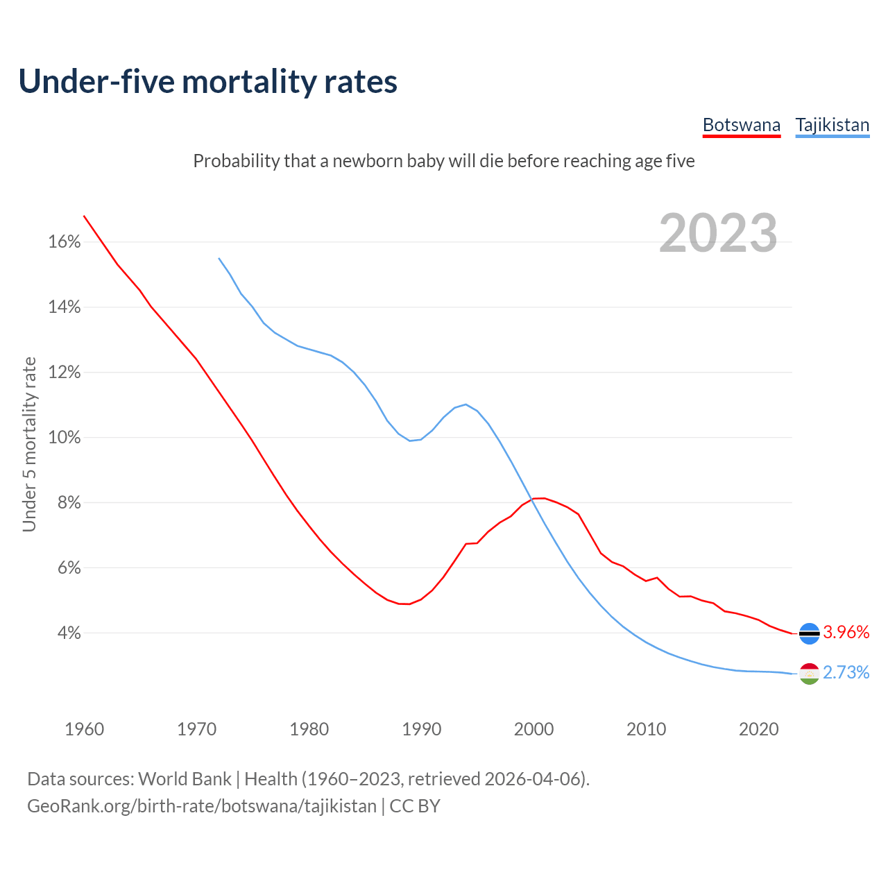 The chance that a newborn baby will die before reaching age five is 3.96% in Botswana and 2.73% in Tajikistan. Above is a chart with historical data on under-five mortality rates.