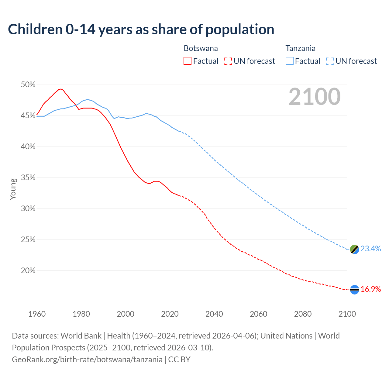 According to the latest available data on birth rates, the fertility rate in Botswana was 2.73 children per woman in 2023, compared to 4.61 in Tanzania in 2023. The replacement level is considered to be 2.1 children per woman.