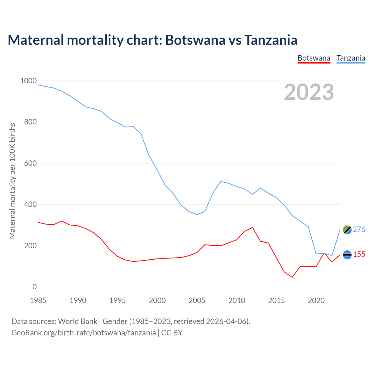 The maternal mortality rate, which is the probability of dying during childbirth or within 42 days of pregnancy termination, is 155 deaths per 100,000 live births in Botswana, compared to 276 deaths in Tanzania.