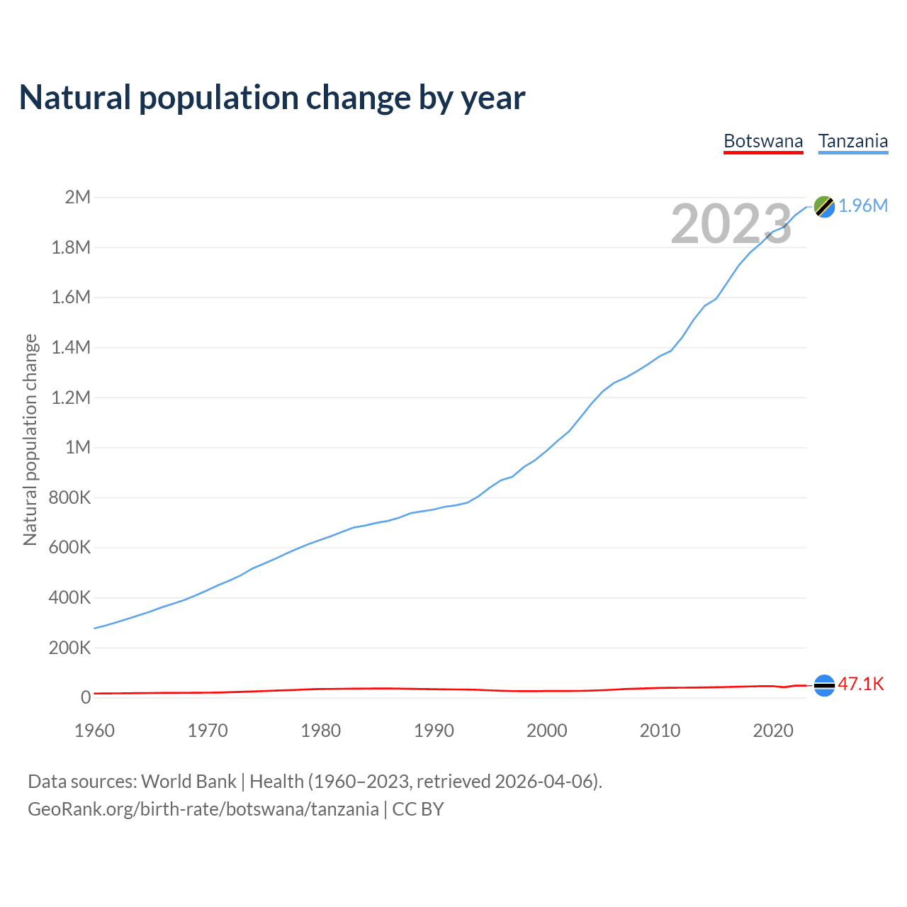 Botswana has an annual birth rate of 24.7 births per 1,000 people, compared to 35.2 for Tanzania. The average number of children a woman is expected to have during her lifetime — the fertility rate, is 2.73 in Botswana and 4.61 in Tanzania — 68.6% difference.