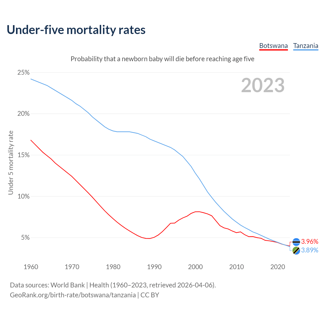 The chance that a newborn baby will die before reaching age five is 3.96% in Botswana and 3.89% in Tanzania. Above is a chart with historical data on under-five mortality rates.