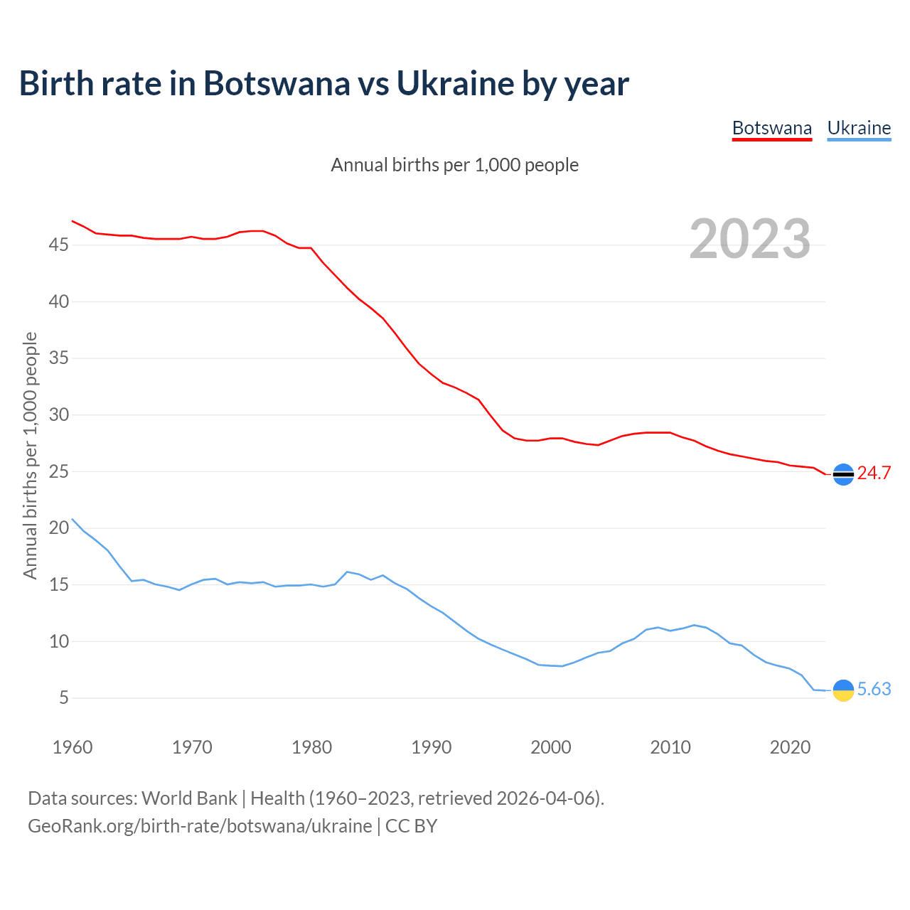 Botswana has an annual birth rate of 24.7 births per 1,000 people, compared to 5.63 for Ukraine. The average number of children a woman is expected to have during her lifetime — the fertility rate, is 2.73 in Botswana and 0.98 in Ukraine — 64.2% difference.